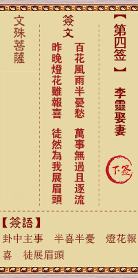 签诗:百花风雨半忧愁,万事无过且逐流,昨晚灯花虽报喜,徒然为我展眉头。
