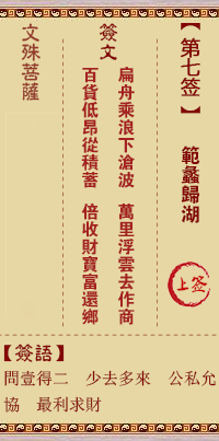 签诗:扁舟乘浪下沧波,万里浮云去作商,百货低昂从积蓄,倍收财宝富还乡。