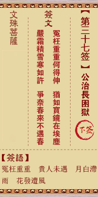 签诗:冤枉重重何得伸,犹如宝镜在埃尘,严霜积雪寒如许,争奈春来不遇春。