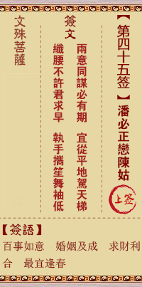诗文解译:两意同谋必有期→两个人有同样的谋望,必然后会有期。宜从平地驾天梯→应当从基础做起。纤腰不许君求早→此谋望当前机缘尚不成熟,因此不宜急求。执手携笙舞袖低→未来当可携手共度,成就功名利禄。