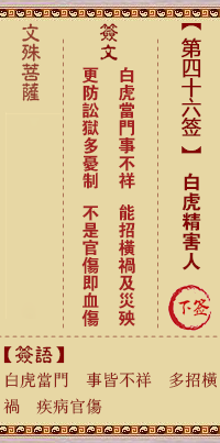 签诗:白虎当门事不祥,能招横祸及灾殃,更防讼狱多忧制,不是官伤即血伤。