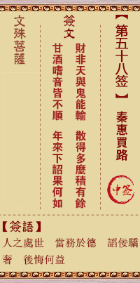 签诗:财非天与鬼能输,散得多么积有馀,甘酒嗜音皆不顺,年来下诏果何如。
