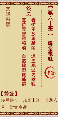 圣意:求财→小利。交易→先难后成。婚姻→成。六甲→生男。自身→秋利。疾病→设送。家运→祈福。寻人→见。失物→东北。移徒→可。行人→至。公讼→延宕。