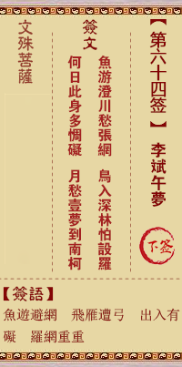 签诗:鱼游澄川愁张网,鸟入深林怕设罗,何日此身多惆碍,月愁一梦到南柯。