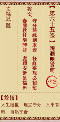 诗文解译:守分随缘到处安→做人处事当安份守己,随缘顺受。枉谋妄想必招愆→不要有妄求,以免惹来灾祸。春兰秋桂随时发→到了八月时,谋望随时启动。处顺安常是福田→此事安顺这就是福田了。福田是指让你修福的田地。意即,此刻当好好的投入经营,当作是修福而做。秋桂:阴历八月也叫‘桂月’。