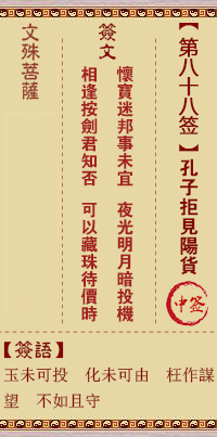 签诗:怀宝迷邦事未宜,夜光明月暗投机,相逢按剑君知否,可以藏珠待价时。