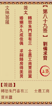 签诗:转怒朱门喜有三,士农工商贾田蚕,婚姻不久成佳偶,求嗣归房得美男。