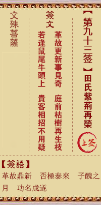 签诗:革故更新事见奇,庭前枯树再生枝,若逢鼠尾牛头上,贵客相招不用疑。