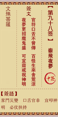 诗文解译:官符口舌不曾传→既没有官司,也没有口舌之争。百怪生来舍荒凉→但却怪事频发生。夜梦更招魔鬼盛→睡觉中还有鬼怪的恶梦。可宜斋戒祝神明→可以持守界斋戒和求拜天神以得保佑。