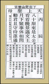 姜子牙名尚,三十二岁上昆仑山,跟随元始天尊四十年,学得一身道法。这一天,元始天尊算出殷商气数已尽,命子牙下山扶周灭纣,享受人间富贵,但是姜子牙一心向道,并不贪图世俗欢乐,决心留在昆仑,天尊告诉他说:“人各有命,因缘如此,岂能违背天意?”姜子牙不敢违拗,只得收拾行囊,下山去了。姜子牙借土遁来到宋家庄,找拜把兄弟宋异人,二人相见如故,宋异人准备了丰盛酒席,招待殷勤,还为七十二岁的子牙做媒人,介绍一位六十八岁的黄花闺女马小姐,两人婚后就在宋家定居下来了。姜子牙待在宋家,仿佛心事重重,不事生产,马氏催促他去做生意,子牙也只好编竹扫帚挑到城里叫卖,一连好几天,连一把也没有卖出去,回到家里,被马氏奚落了一阵。宋异人看不过去,就免费提供麦子,磨成了面粉,要子牙改引卖面粉,这是三餐要吃的必需品,看来必有赚头。姜子牙摆好摊子,准备开张,突然一匹失控的马飞奔而过,麻绳缠住马脚,面粉散落满地,暮然一阵强风吹过,面粉随风飘扬,没卖得分文,面粉已颗粒无存了。回到家里,老夫妻又吵成一团,宋异人说尽好话,又出了个新点子,这一回姜子牙要开饭馆了。菜色齐全,又卫生又干净,顾客却还是不上门,到头来,饭菜都变酸变臭,本钱又耗光了。宋异人左思右想又出了主意,劝子牙到城里卖猪羊。这时因为久旱不雨,纣王诏告百姓严禁屠宰,积功德祈求上天普降甘霖。子牙赶着猪羊,一进城就被守兵逮个正着,以违禁犯法,把一群猪羊全都没收,这一回赔得更惨。子牙屡遭挫败,宋异人也被拖累了不少,却毫无怨言,反而安慰他,终有一天会时来运转,还办了酒席为子牙打气。闲谈中,宋异人知道子牙擅长算命卜卦,就在南门外,打点了一间房子,挂起“铁口直断”的招牌。子牙卜卦灵验通玄,没多久就轰动京城,远近皆知,偏偏就有不信邪的玉石琵琶精,幻化成一位俏佳人前来问卜,要试探子牙的功力,一照面,子牙已知来者并非善类,伸手扣住她的命门,拿起紫石砚台,朝脑袋把她打死了,围观者哗然,人命关天,事情闹进皇官了,子牙坚称这妇人是妖物,当场用三昧真火,终将琵琶精烧出原形,纣王看姜尚身怀绝学,封他为下大夫。这琵琶精原是妲巳的姐妹淘,眼看他活活被子牙烧死,岂肯干休,眉头一皱,计上心来,耸悀纣王建造鹿台,这鹿台工程浩大,子牙一看需三十三年才能完成,劳民伤财,谏言造台无好处,纣王大怒,要把他捉来冶罪处死,子牙眼看瞄头不对,跳进桥下借水遁逃回家了。马氏一见子牙丢了官,一时气愤不过,即时要求离婚,子牙再三好言相劝,马氏也全无顾念惜日恩情,收拾细软就扬长而去了,子牙也向宋异人辞别,从此隐居蹯溪,每日到渭水河边钓鱼,等待时机了。