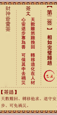 求得此签暗示目前福报不佳,问事求谋不可,启示当事人,除要谨慎周密,还要心存善念不可有欺瞒狡骗之心。仍可化险为夷。预防口舌是非。此签官员占之,纷扰多变。以和为贵,要诚意正心求神,去祸生祥。文人占之,定不下心。功名难进,学业退步,考运不佳。商人占之,财利耗散。合伙主有小人离间,宜谨慎周密,财利难进易退,前途多困难。艺人占之,纷扰多变。小人为祸须以和为贵,要诚意正心求神化解。凡事不可三心两意,否则空劳无成。恋人占之,彼此私情,互相离间,分分合合。病人占之,病危险宜更医。