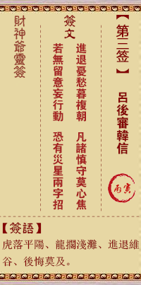 目前的境遇就像,猛虎到了平地,即无用武之地。只能被平地狗群所欺负,猛龙游到浅水的地方,被困住浅滩,正是进退维谷的时候,今天的遭遇,也许就是从前做错了事,因果报应,后悔也来不及了。此签,表示你将有灾祸临头,或许是口舌是非,或许是官司灾难等等,最好能自我反省,勇敢认错忏悔。才能消灾于无形,正如韩信的故事,他虽然帮助汉高祖得天下,但功高震主,却不知功成身退,以免招忌的道理,且好名争位,使汉高祖猜忌,怀疑他要造反,乃暗使吕后诱他到"未殃宫"而遭杀身之祸。