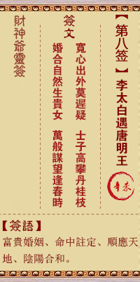 求得此签暗示功名富贵婚姻俱足,命中皆有注定,问事求谋可成,不必急躁,一个人只要尽其在我,尽力去做,该得富贵的时候,富贵自来。如果还没有圆满,表示时机未到,尚待努力,问此签若在春夏占得,皆主吉利,不过必须是,才得吉应,若是心术不正的人,虽抽得此签,仍然不能如愿,善恶各有定数。此签官员占之,平安顺利。有升迁之喜,贵人扶持。文人占之,此签最利功名,得贵人扶持,学业辛勤有成。商人占之,守成吉。平顺小财,外出更吉有大财。艺人占之,逢春大吉才艺可展,得贵人扶持下,名利双收。外出远行有大财,秋季平平。恋人占之,婚姻大吉,暗示阴阳合和。有鱼水之乐。和合圆满生贵女。双喜临门之兆也。病人占之,多休养可保安康。喜事之兆。