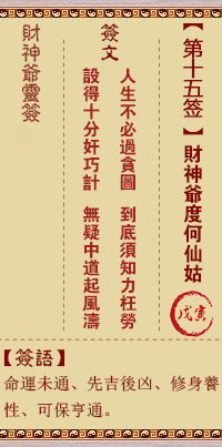 财神爷来到凡尘,引渡何仙姑,驾鹤成仙,名列八仙而名扬天下,入金阙受玉帝敕封,逍遥的过着一朝又一朝的天上神仙生活。此签虚幻,不可贪图眼前。纵使巧计得逞。亦无福消受。切勿妄求,谨守本份,努力工作,自得上天保佑。最利学道参禅。不利姻缘等事,礼佛之人,只要心诚修真练性,功德圆满之日,当证菩提,逍遥世外。