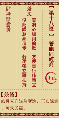 抽得此签暗示目前福报俱足,问事求谋可期,应在三春,好事入门。内人有决断力,切勿猜疑。此签官员占之,用人不疑,疑人不用,要授权给部属,才能发挥效率。文人占之,功名,有希望,必须再得人和,学业增进,金榜题名。商人占之,公平待人,商情如锦上添发,财源广进,合伙做生意,要有管,鲍共同经商的精神,有远见,收获必多。艺人占之,谋望要共同会商,集思广益,广交人缘。不可独断独行,一切自然顺利,春天大吉。恋人占之,不必三心两意猜疑,是良缘。好事将近。病人占之,会渐渐痊愈。