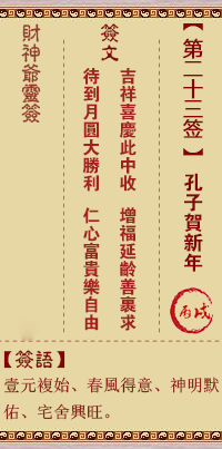 一元复始满堂皆春,喜气洋洋。积善之家,定获神佛护佑,万般求谋都能吉祥如意。此签显示,在有充分的准备工作和周详计划之下,万事如意,谋望可以达成,明年立春以后循序渐进,顺利成功。若平日不修德的人抽到此签,则恐有灾星到来,宜从速行善补过,可获灾消福临。孔子元旦贺正祝辞,元旦清辰一柱春,叩谢天地。祝辞里所求的皆为众人而求,没有私心,我们应效法孔子这种无我无私的精神,不能对神明有太多的奢求,应有只要众生皆安康"我若贫穷亦无妨"的大爱,请神慈悲降福人间。久而久之,定获感应。
