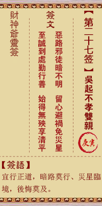 上苍是不容忤逆不孝,不走正道的,喜欢使用权谋狡诈的人,一旦福报用尽而失败就后莫及了。此签用吴起不孝的故事,来警惕世人,为人不可只求目的不择手段,甚至母死亦不奔丧,故不得善终。百善孝为先,为人必须能孝顺父母,敬老尊贤,不可好大喜功,倒行逆施。是非不分而树敌无数。只要诚意正心。行运虽有不顺,亦能化险为夷。凡事宜忍,不急功进利,防小人挑拨诬陷,莫理小人言。广纳百川,定能得到神明庇佑。