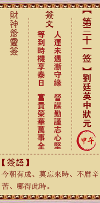 人运未遇渐守缘、营谋勤谨志心坚、等到时机享泰日、富贵荣华万事全。