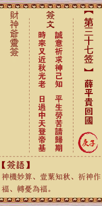 求得此签暗示目前福报平平,问事求谋可期,表示多求神作福。即将转好运,目前的困境,不必多久,就会脱困而创出新局面。此签官员占之,宜求神避凶。防小人奸计案害之祸。被官欺。文人占之,大器晚成。学业祷神得进。商人占之,注意杯酒误事及意外之祸。财利迟聚,官事宜和,宜求神避凶继续努力,有志者事竟成。春夏吉。艺人占之,宜防杯酒之祸,口舌是非,意外,官非等事,秋冬不吉,宜求神避凶。春夏皆吉,二月起皆吉,谋望先难后易,时未遇悠游自处,遇午年月日大吉,各利自顺,众人钦仰,财帛满盈。恋人占之,离而复合,有情人终成眷。此签最利复合。可得神仙提携百般如意。病人占之,祷神可愈。若在秋冬,要等来春,方能治好。