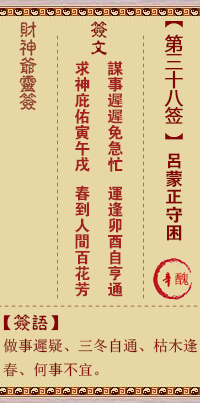 求得此签暗示目前福报平平。问事求谋慢成,宜待时而动。不遇时机及贵人徒劳无功。取青紫配合,日月祥吉,做事吉祥如意,亨通顺利。此签官员占之,干支逢寅午戌年,人事两阻,不可进取,反有祸灾。宜求神避凶。若逢亥子丑年月日,渐有亨通,至卯寅大吉。文人占之,功名迟进须待时而进,继续努力。商人占之,宜求神避凶。审时不得妄动。艺人占之,宜求神避凶。色取青紫配合。鸡兔猪之饰物可开运。遇虎马狗之人不利。遇鸡兔贵人顺利,名成利通。遇卯酉年月日,做事得时谋望不劳心力而成。恋人占之,佳偶天成,百年好合。病人占之,慢慢痊愈。