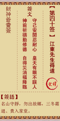 何须离乡外出奔波?、只要守住名山(守旧)暂避风霜,当风霜退去,大地回春时,就会有贵人来拜访你了。这首签诗启示当事人,只要是人材,就不会被埋没的,不必到处去奔波推销,只要勤修身,充实自己内涵,无灾无患,时机一到,贵人到位就能一展抱负了。