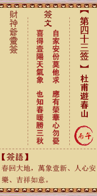 官事:早和。功名:遇贵。婚姻:合宜。求财:渐丰。病:灾消。家宅:昌隆。六甲:生男。运途:占春。谋望:寅卯。移居:春可。失物:急寻。农业:早丰。地理:吉利。学业:必成。商业:大利。求职:春间。流年:大吉。