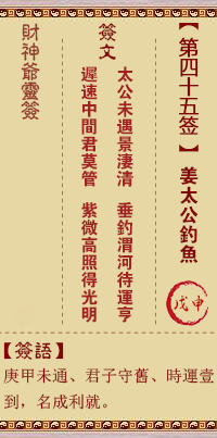 太公未遇景凄清、垂钓渭河待运亨、迟速中间君莫管、紫微高照得光明。