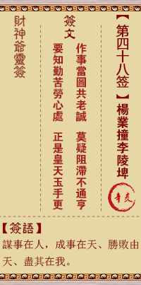 从前失败了,即使一败涂地,也不要紧,东山再起吧!虽然元气大伤,已经没有从前的能力,只要力图振作,乃然尚堪一击。你的命运定数,前三三与后三三的盛衰循环道理?这首签诗:明示人不可以成败论英雄,仍然还是会有成功的一天。虽然有过失败的经验,但不可气馁,只要再振作,再奋斗,失败为成功之母,有志者事竟成,不轻言放弃。终会有成果的。