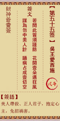 佳人暗带杀机,你要知道防患,不要中了美人计,不可言听计从,纵然美人有倾国倾城的容貌,你也要把定意志,不要被美色迷惑,才不会倾家荡产,身败名裂。此签引用越王勾践献西施给吴王夫差的故事,警示当事人,不要误中美人计,也可引伸为凡事谨慎,莫贪非份利益,以免陷入陷井,招致祸害。