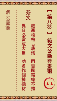 此签有”事在人为”之意。鼓励当事人,自强不息。有些人常常虎头蛇尾,短时间的努力不见成效,就打算放弃。然而会成功的人,背后的打拚必定多于常人,辛苦也不足为外人道。范仲淹画粥的故事,最令人感佩的即是他过人的耐力、专注的自制力以及经年累月,从不间断刻苦读书的精神。就如岁寒松柏,在历经雨雪风霜的侵袭后,仍然挺立不摇,坚强地存活下来。因此凡事若定下目标,就应全力以赴。切勿轻言放弃导致功败垂成。只要继续努力、持之以恒,必能先苦后甘,得到丰硕完美的成果。