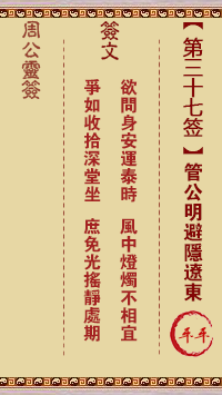 本签也。风前灯烛之签也。不相宜者。惟凡事小心。谨慎则吉也。君必须收拾深堂坐。亦即是得静为宜吉。如动则凶至。只好暂时忍耐之。时到之时。必有吉祥之象。随君而来。易言之。静处安身命待时泰。动心惹祸。静守救危耶。
