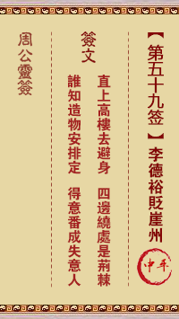 此签有”是非难断”之意。告诫当事人,喜恶勿过于分明。我们有时会对某些人觉得反感,不管对方说什麽做什麽,就是看不顺眼,非常排斥。甚至双方互不相让,情势也越陷越僵。其实同样的人、事、物,在你看来或许不好,但若换在其他人眼中,却变成是好的。须知”好”与”坏”很难论定,甚至没有一定的准则。但人都是用自己心里的一套标准来评断,而每个人又有不同的想法,所以看出来的事情就有了好、坏、对、错的分别。如果能少点主观、多点客观,好恶心就不会那麽重,也比较不会太固执。另外,凡事不要替人强出头,做好自己的本份,修身养性。