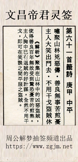 文昌帝君灵签第六十一签:庚甲中平